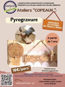 Séance Spéciale pendant les prochaines vacances scolaires pour les enfants à partir de 7 ans le mercredi 25 février de 14h30 à 16h00: Pyrogravure avec Céline